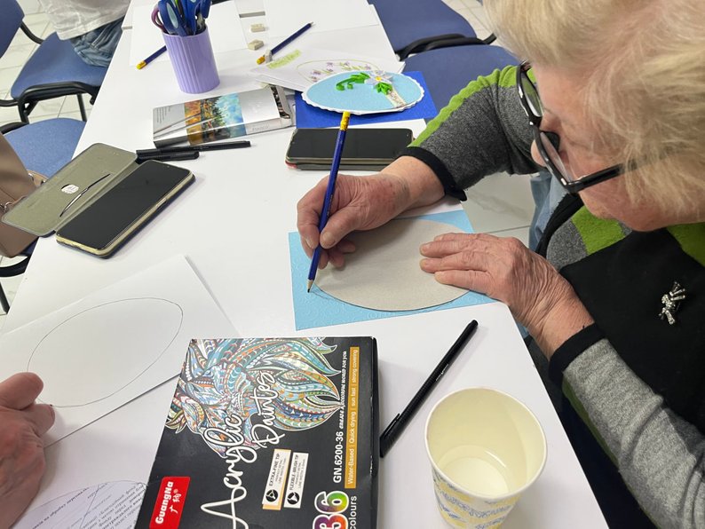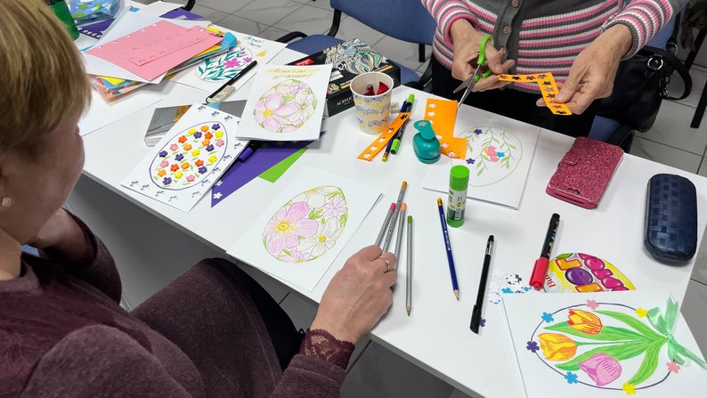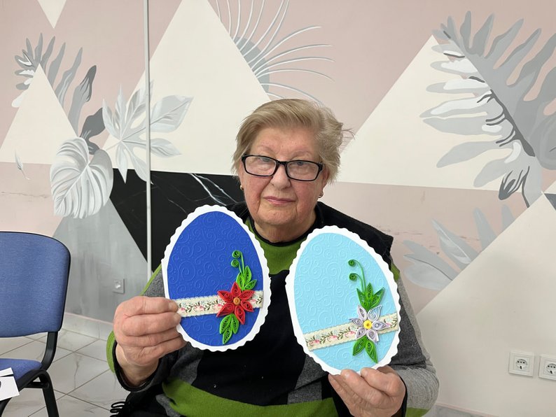 "Сьогодні робимо листівки, щоб трішки порадувати тих, хто цього потребує. Я рада, що я можу щось зробити для інших", — розповідає жителька Тетяна.