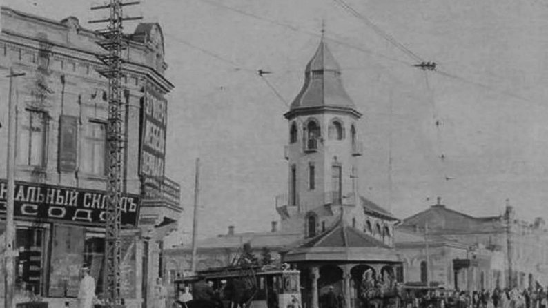 Будівля підстанції та зупинки трамваїв у центрі міста. Миколаївський обласний архів