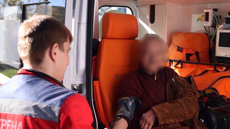 Медик міряє тиск власнику будинку, який попередньо отруївся продуктами горіння внаслідок пожежі у Миколаєві, 29 жовтня. ГУ ДСНС у Миколаївській області Зранку 29 жовтня у Центральному районі Миколаєва зайнявся приватний будинок. Власник оселі попередньо отруївся продуктами горіння.