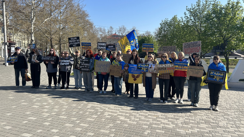 Люди з плакатами та прапорами під час хвилини мовчання у Миколаєві. Суспільне Миколаїв/Маріетта Мкртчян У центрі Миколаєва 19 квітня традиційно люди зібрались на хвилину мовчання, щоб вшанувати полеглих на війні. Це вже 55-та акція, яку організовують у місті.