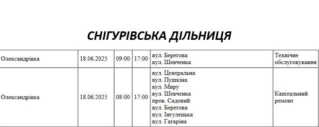 Графік відключення світла по адресах 18 червня, Снігурівська дільниця. АТ “Миколаївобленерго” Інші дільниці регіону