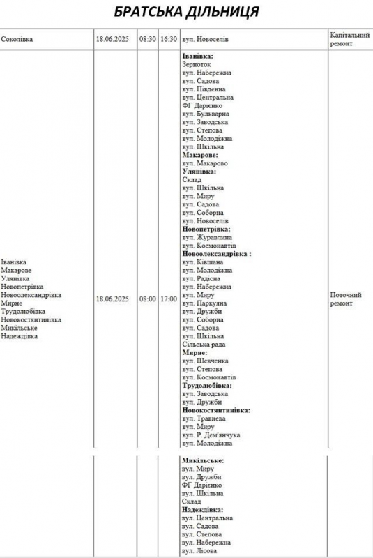 Графік відключення світла по адресах 18 червня, Братська дільниця. АТ “Миколаївобленерго”