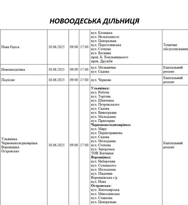 Графік відключення світла по адресах 18 червня, Новоодеська дільниця. АТ “Миколаївобленерго”