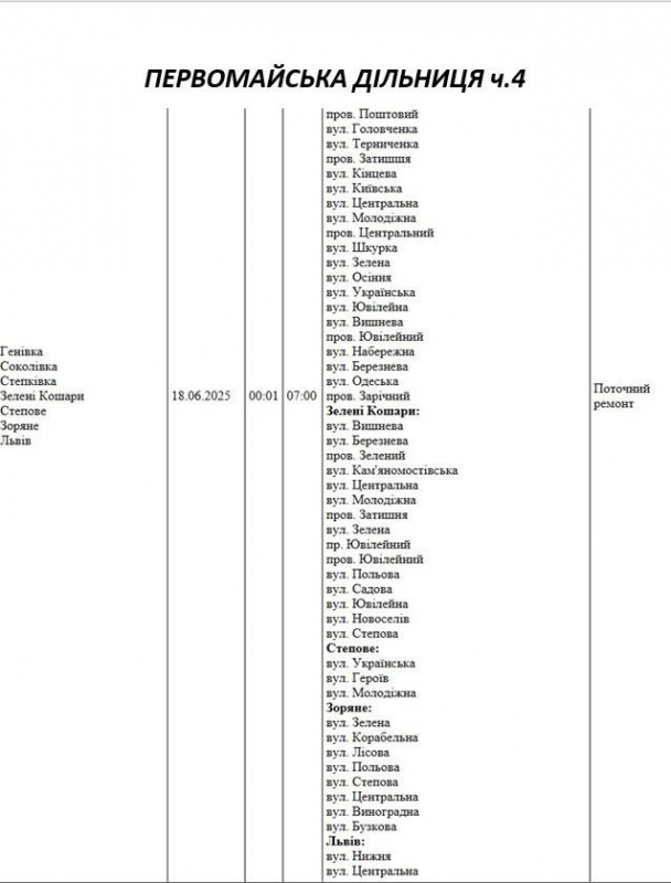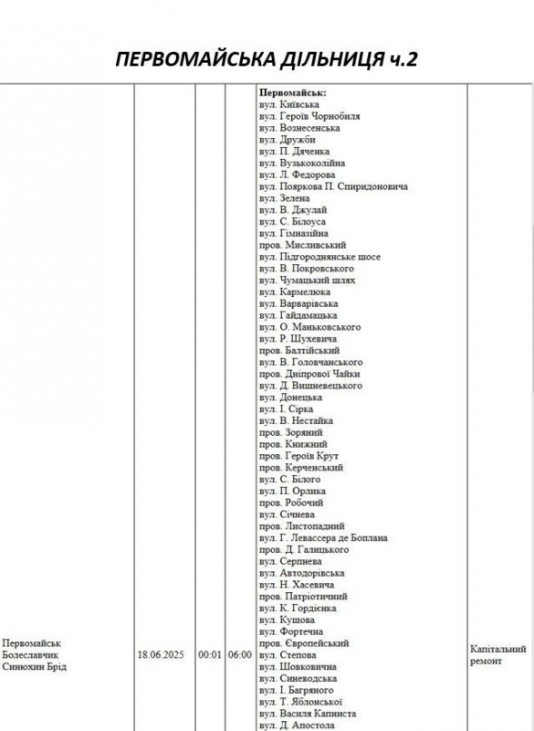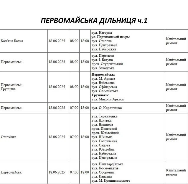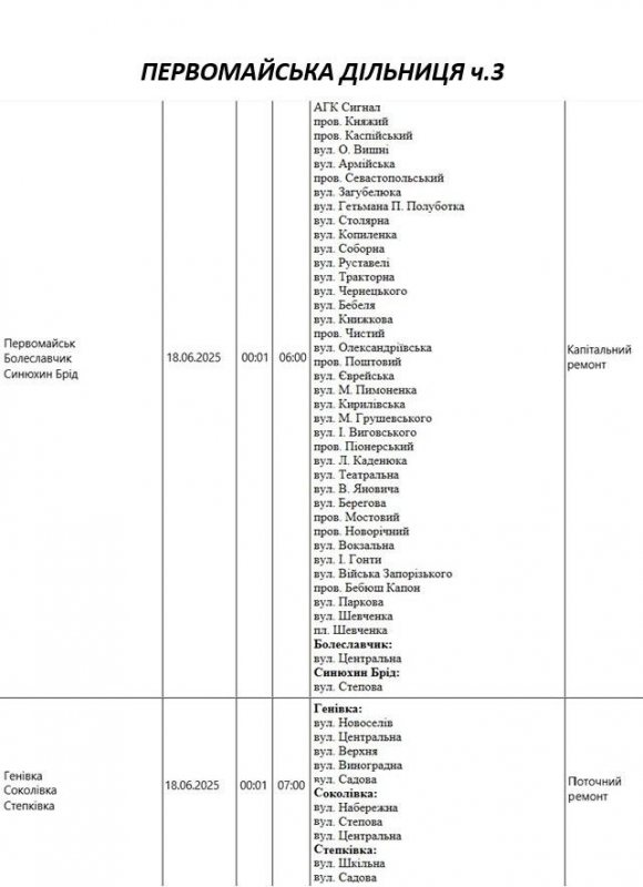 Графік відключення світла по адресах 18 червня, Первомайська дільниця. АТ “Миколаївобленерго” Вознесенська, Баштанська та Снігурівська дільниці