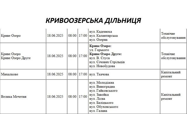Графік відключення світла по адресах 18 червня, Кривоозерська дільниця. АТ “Миколаївобленерго”