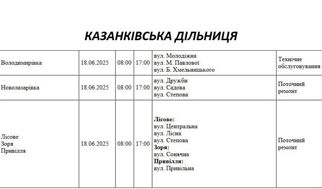 Графік відключення світла по адресах 18 червня, Казанківська дільниця. АТ “Миколаївобленерго”