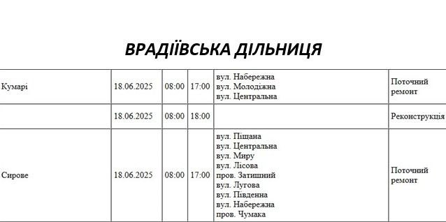 Графік відключення світла по адресах 18 червня, Врадіївська дільниця. АТ “Миколаївобленерго”