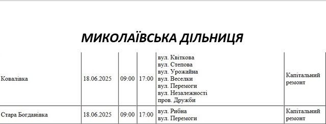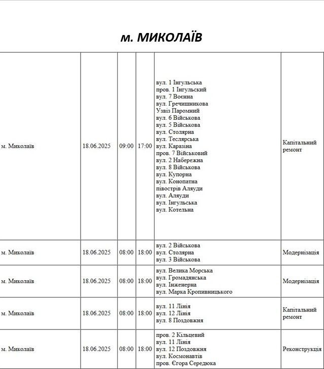 Графік відключення світла по адресах 18 червня, Миколаївська дільниця. АТ “Миколаївобленерго”