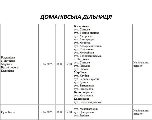 Графік відключення світла по адресах 18 червня, Доманівська дільниця. АТ “Миколаївобленерго”