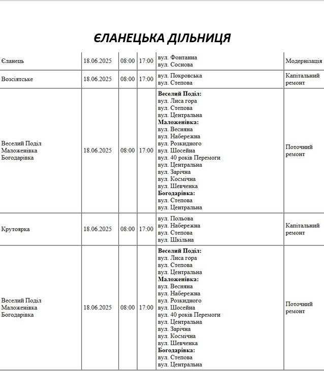 Графік відключення світла по адресах 18 червня, Єланецька дільниця. АТ “Миколаївобленерго”