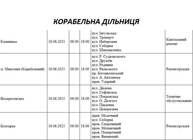 Графік відключення світла по адресах 18 червня, Корабельна дільниця. АТ “Миколаївобленерго”