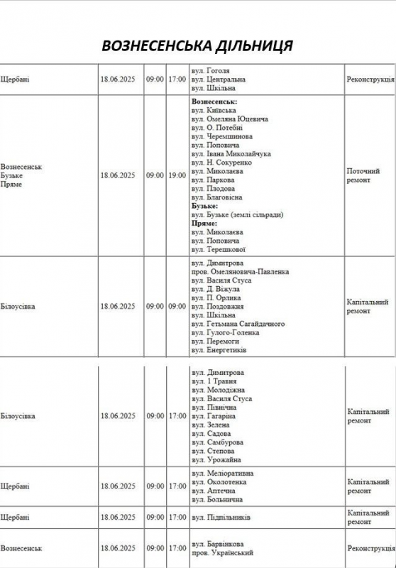 Графік відключення світла по адресах 18 червня, Вознесенська дільниця. АТ “Миколаївобленерго”