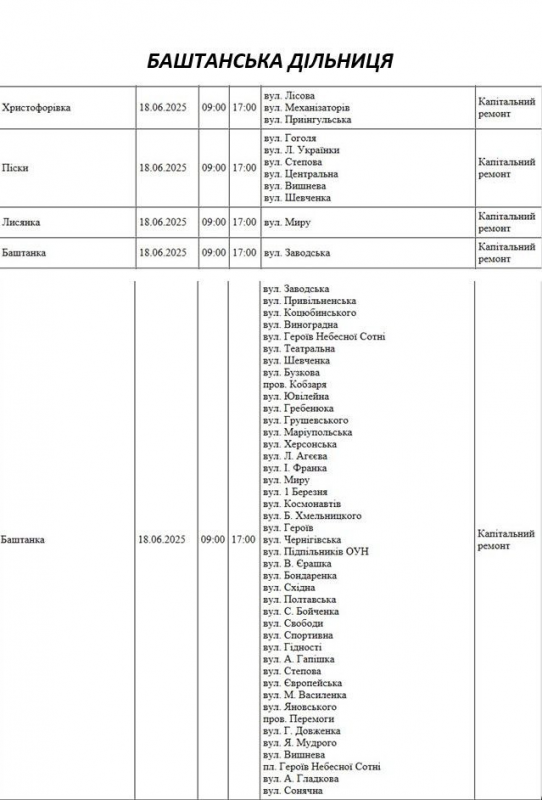 Графік відключення світла по адресах 18 червня, Баштанська дільниця. АТ “Миколаївобленерго”