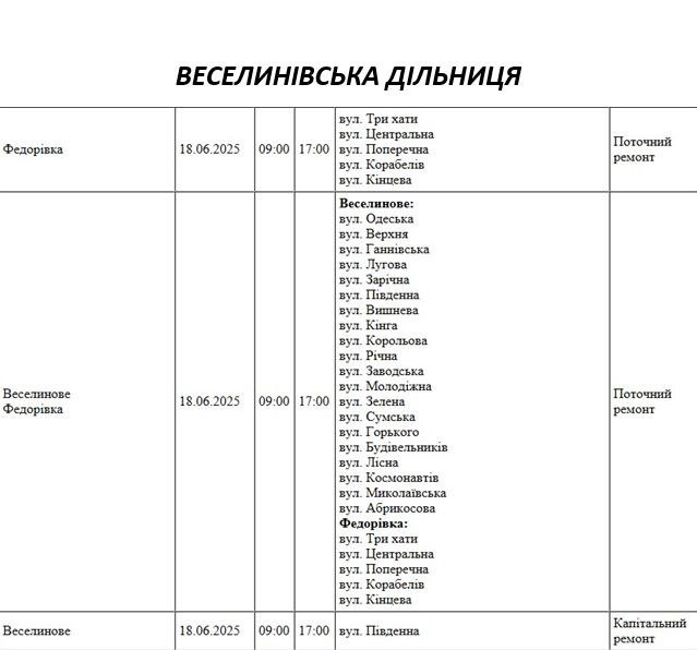 Графік відключення світла по адресах 18 червня, Веселинівська дільниця. АТ “Миколаївобленерго”