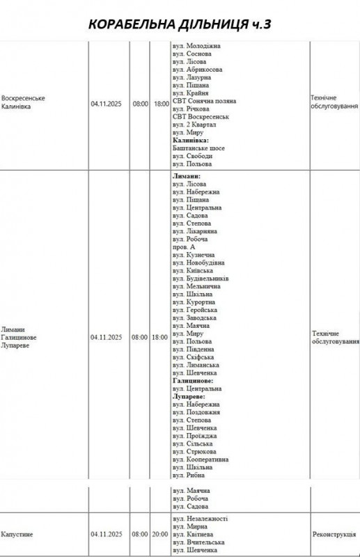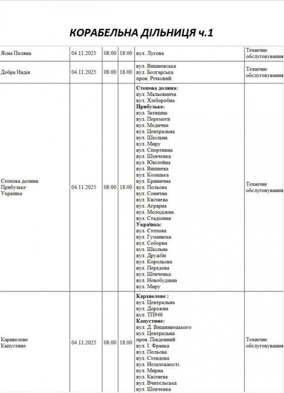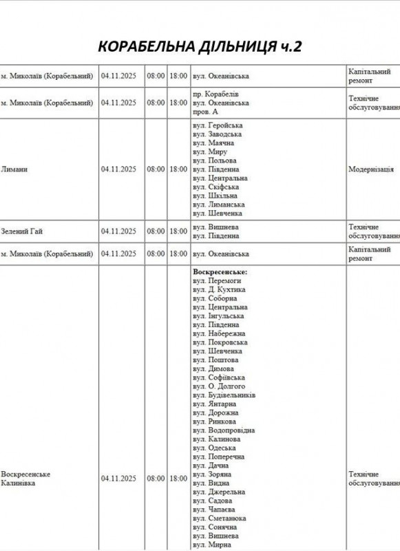 Графік відключення світла по адресах на 4 листопада, Корабельна дільниця АТ “Миколаївобленерго”