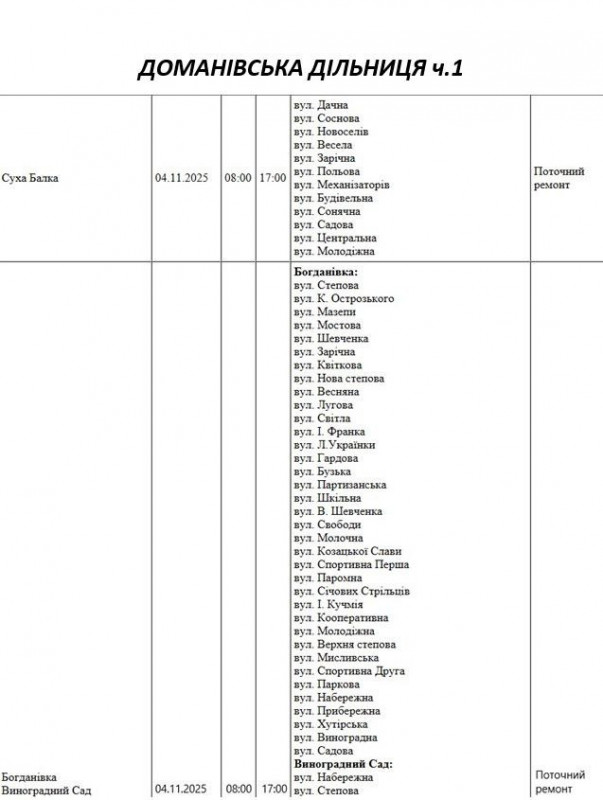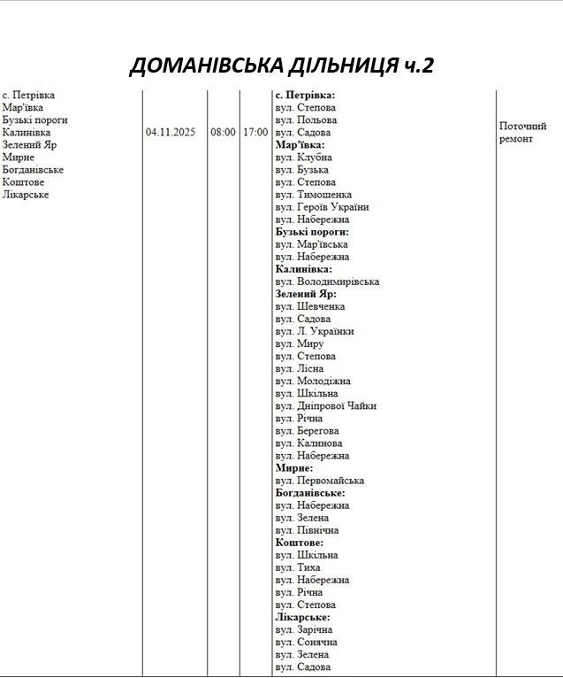 Графік відключення світла по адресах на 4 листопада, Доманівська дільниця АТ “Миколаївобленерго”