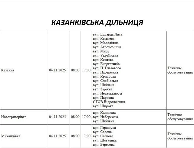 Графік відключення світла по адресах на 4 листопада, Казанківська дільниця АТ “Миколаївобленерго”