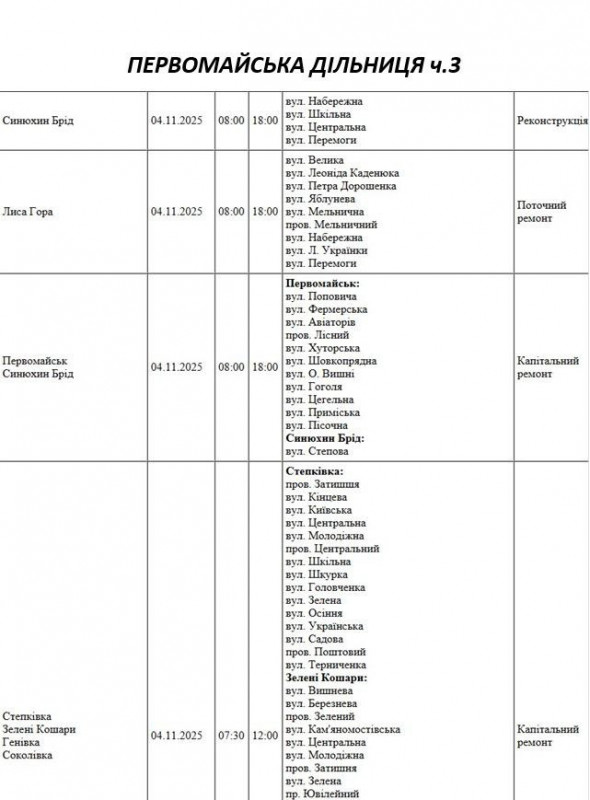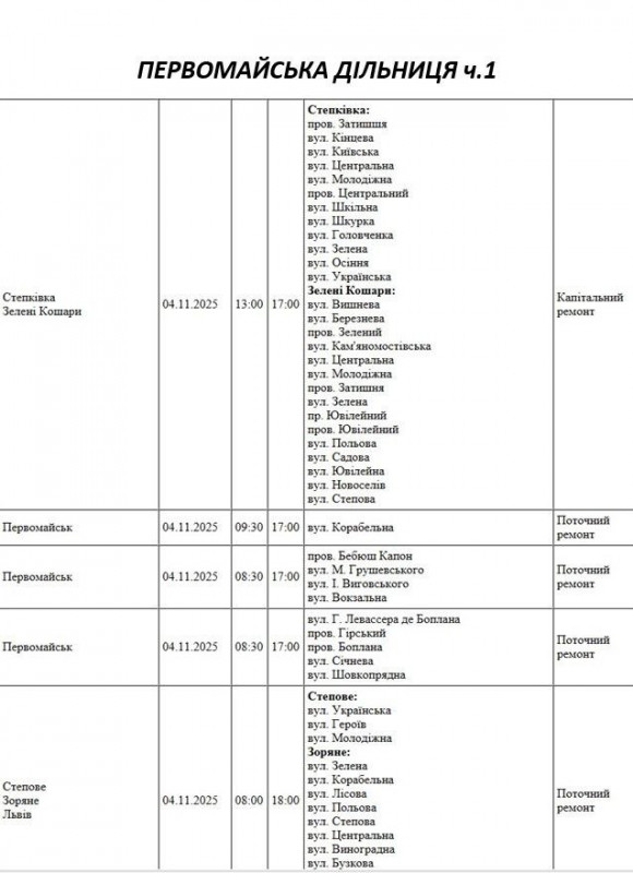 Графік відключення світла по адресах на 4 листопада, Первомайська дільниця АТ “Миколаївобленерго”