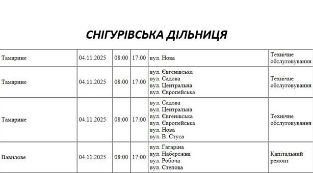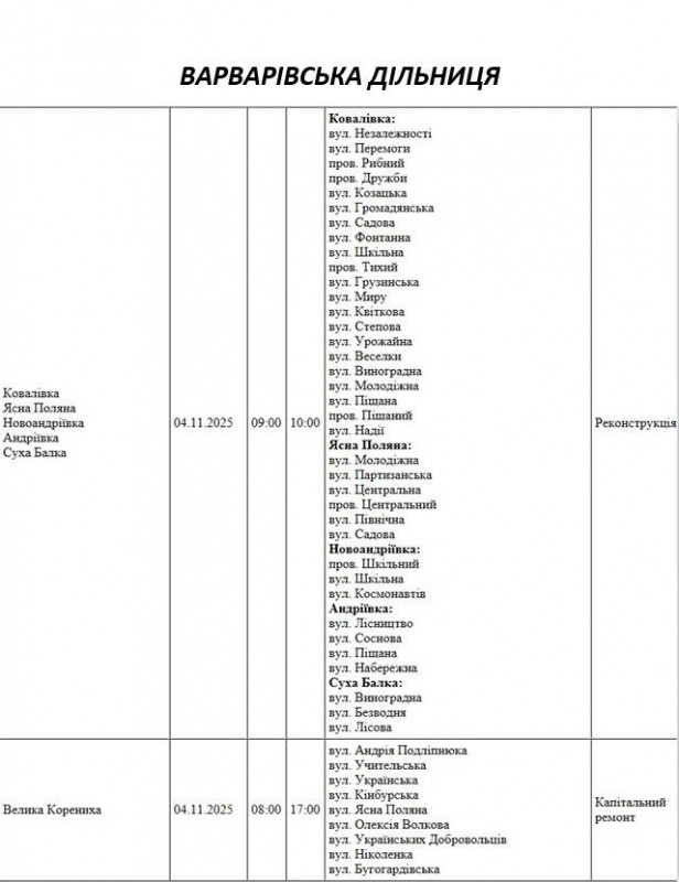 Графік відключення світла по адресах на 4 листопада, Варварівська дільниця АТ “Миколаївобленерго”