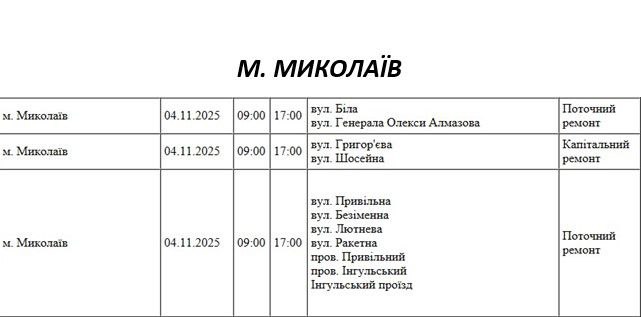 Графік відключення світла по адресах на 4 листопада, Миколаївська дільниця АТ “Миколаївобленерго”