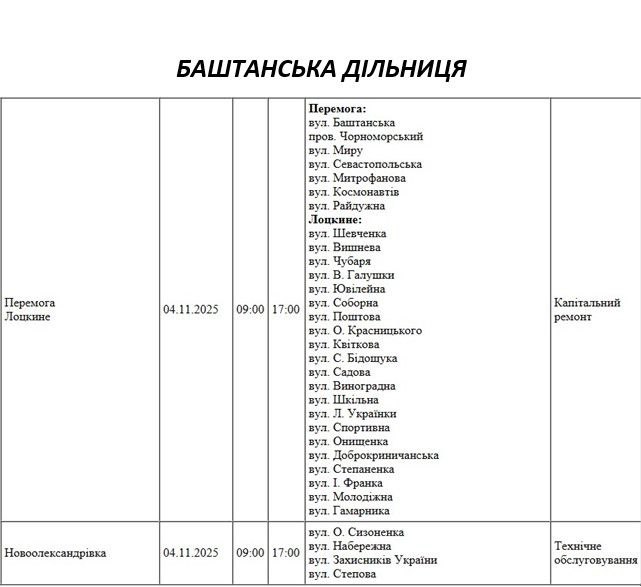 Графік відключення світла по адресах на 4 листопада, Баштанська дільниця АТ “Миколаївобленерго”