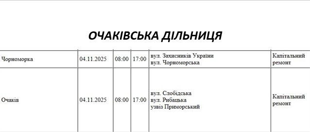 Графік відключення світла по адресах на 4 листопада, Очаківська дільниця АТ “Миколаївобленерго”