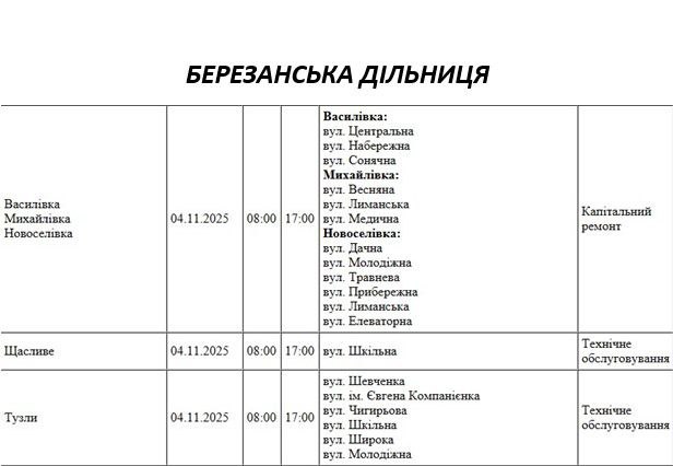 Графік відключення світла по адресах на 4 листопада, Березанська дільниця АТ “Миколаївобленерго”
