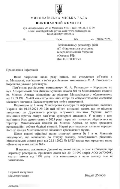 Місце демонтажу бюста М.Римського-Корсакова в Миколаєві. Суспільне Миколаїв/Діна Плетенчук У Миколаєві у 2025 році демонтували погруддя російському композитору Миколі Римському-Корсакову, однак публічно про це стало відомо лише зараз із відповіді міської ради на запит Суспільного. Пам’ятник, що стояв на вулиці Адміральській біля Дитячої музичної школи №1, розташовувався на території гімназії імені Миколи Аркаса, яка нині відновлюється після пошкоджень, завданих російським ракетним ударом.Демонтаж поза публічною увагою