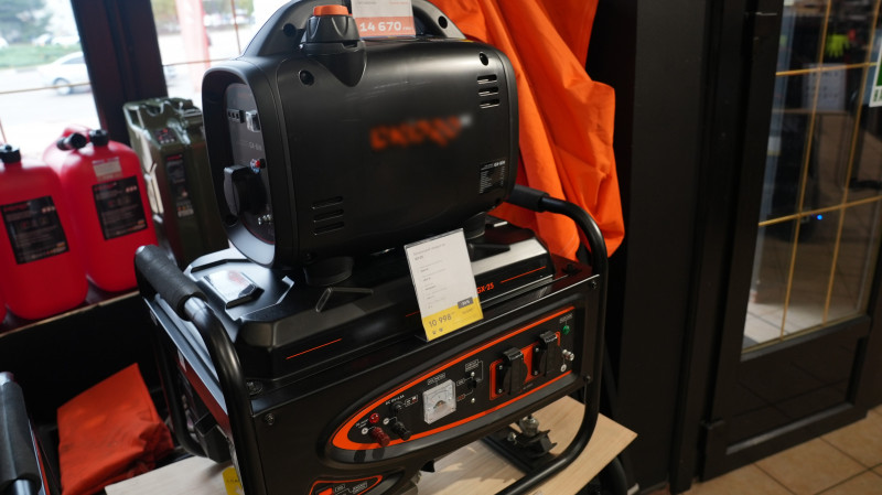 "Далі присутній також інверторний генератор на два кіловати, ціна його зараз акційна — 20 895 гривень. Він уже може підключати і чайники, і фени, тобто, як я кажу, можна і для побутового використання, і для транспортування".