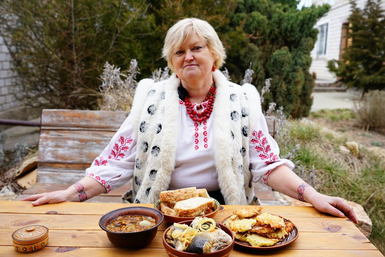 Господиня Наталя Ємельянцева сидить за столом поруч із приготовленими стравами. Суспільне Миколаїв/Олександр ГордієнкоШтурмові роботи: бійці миколаївської ТрО опановують нову техніку, якою керують джойстиком