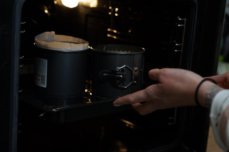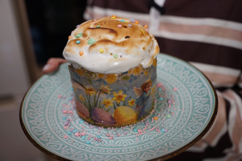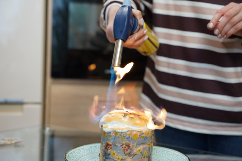 Коли сирна паска готова, Олеся дістає її з духовки, аби охолодити — 10-15 хвилин у морозилці достатньо, каже дівчина. Після цього господиня наносить збиті білки і обпалює верхівку страви пальником.