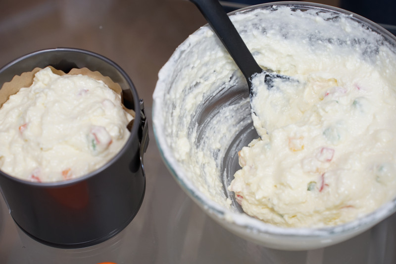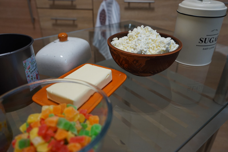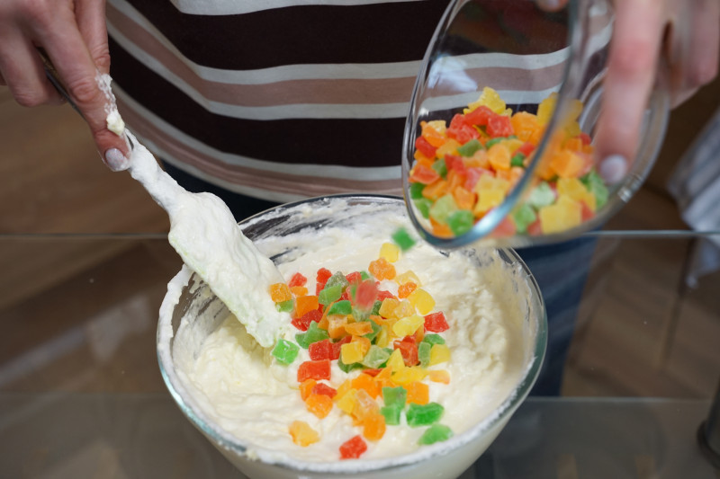 Поступово в так зване тісто вмішуються цукати, й маса перекладається у форму для запікання. Олеся наливає в деку воду, туди ж ставить форму та відправляє все у розігріту духовку на пів години. Поки паска запікається, Олеся збиває ще білки, щоб прикрасити страву.
