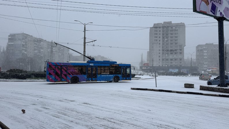 Тролейбус під час руху. Суспільне Миколаїв У Миколаєві комунальні служби та транспортні підприємства працюють у посиленому режимі, щоб забезпечити перевезення громадян попри відключення електроенергії та складні погодні умови.