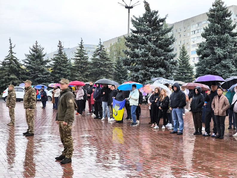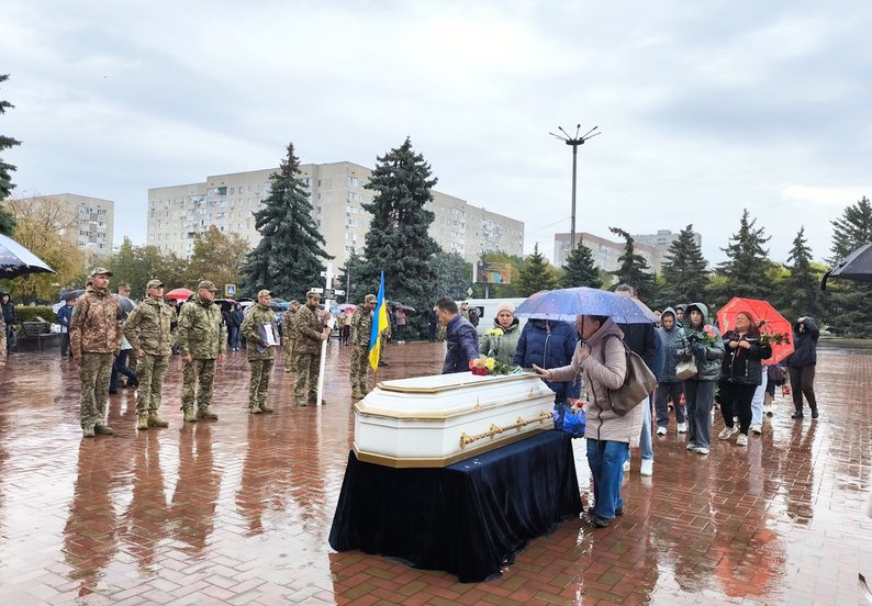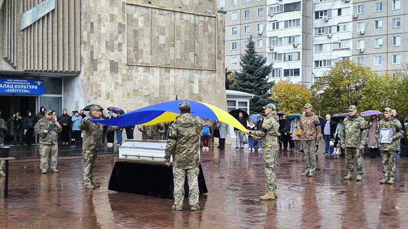 Прощання із загиблим військовим Денисом Тяжельніковим, 7 жовтня 2025 року. Міськвиконком Південноукраїнська