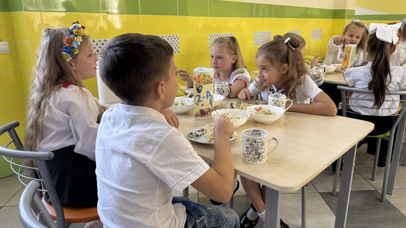 Діти у шкільній їдальні, 8 вересня 2025 року, Миколаїв. Суспільне Миколаїв/Олександр Гордієнко У грудні в 23 миколаївських школах у тестовому форматі працюватиме кейтеринг. Їжу до їдалень доставлятимуть на час обіду школярів, щоб зберегти температуру порцій.