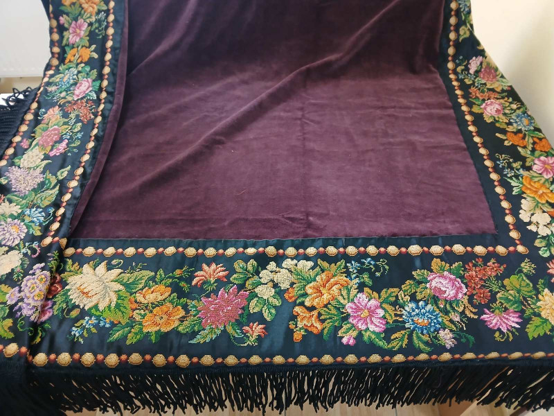 "За спогадами родини, виконали вишивку шовковими нитками чорниці жіночого монастиря наприкінці ХІХ століття. Середина скатертини з тонкого оксамиту, на жаль, не збереглася, згодом її замінили сучасним оксамитом".