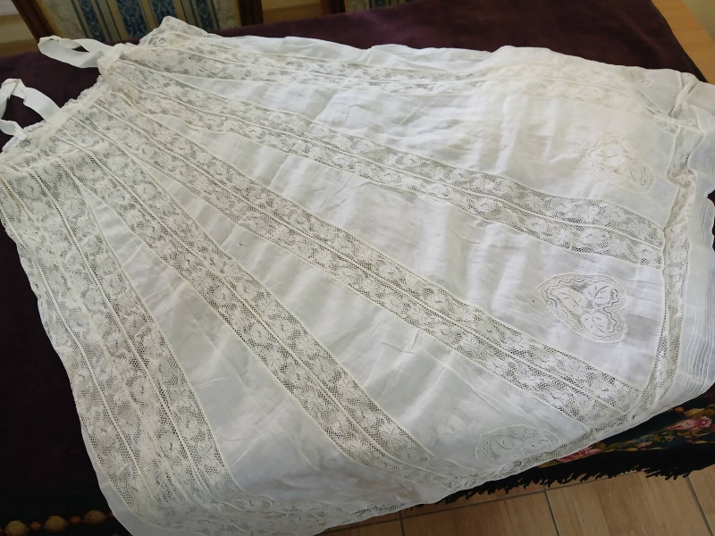 - Святковий кухонний фартух із вибіленої бавовняної тканини, прикрашений фабричною вибійкою;