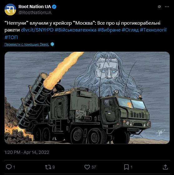 22:31 Голова Одеської обласної військової адміністрації Максим Марченко заявив, що судно підбили українські військові за допомогою ракетного комплексу "Нептун" українського виробництва.