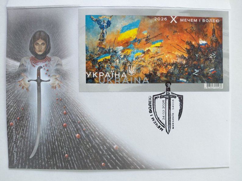 Погашення марки у Снігурівці. Фото: Дмитра Пʼяніка АТ "Укрпошта" офіційно ввела в обіг новий поштовий набір "Мечем і волею". Його випустили до четвертої річниці повномасштабного вторгнення РФ. Спецпогашення відбулося в усіх регіонах України, на Миколаївщині цю процедуру здійснили у Снігурівці.