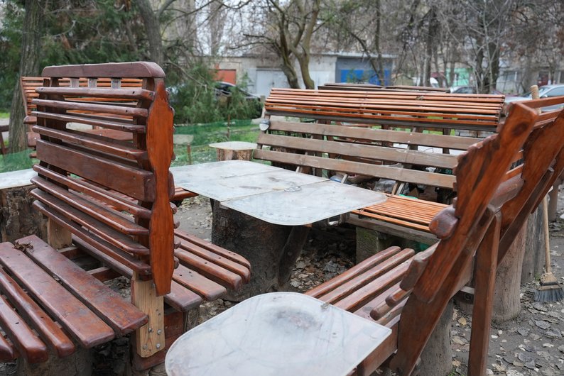 Дерев’яні лавочки та стіл на локації. Суспільне Миколаїв/Маріетта Мкртчян