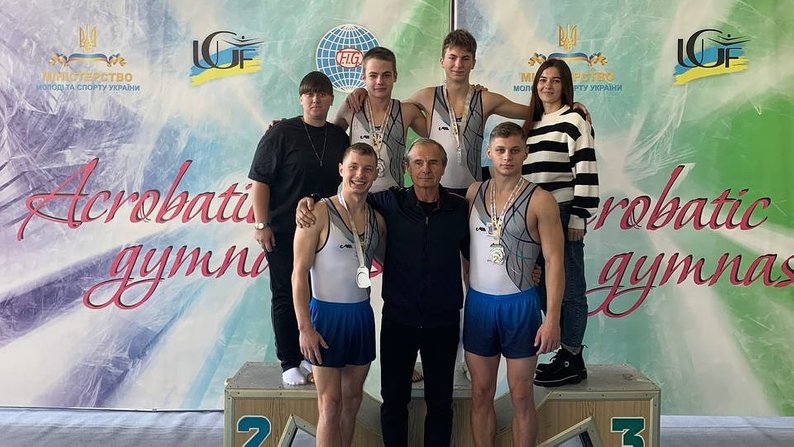 Миколаївські спортсмени з тренерами на чемпіонаті зі стрибків на акробатичній доріжці, Вінниця, жовтень 2025 року. Управління молоді та спорту Миколаївської ОВА У загальнокомандному заліку команда Миколаївської області посіла третє місце. Чемпіонат серед дорослих відбувався з 13 до 15 жовтня у Вінниці.