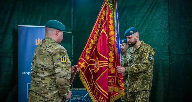 Полковник Олександр Тоненчук передає бойовий прапор 36 бригади морської піхоти підполковнику Кирилу Орлюку. 36 ОБрМП