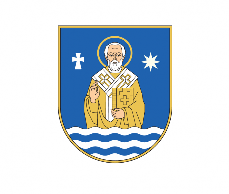Перший проєкт герба передбачає щит, поділений хвилеподібною лінією на синє та срібне поля. У центрі верхнього поля — поясне зображення святого Миколая із золотим німбом, який благословляє правицею та тримає Євангеліє.