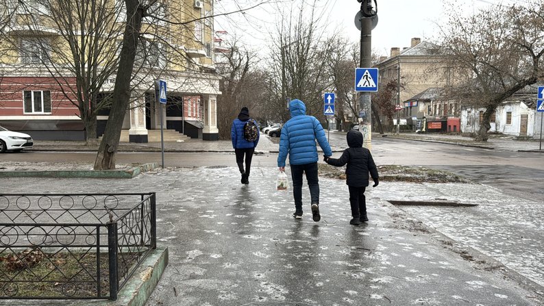 Люди йдуть тротуаром, вкритим льодом, у Миколаєві. Суспільне Миколаїв/Юлія Голокоз На Миколаївщині очікується погіршення погодних умов. 31 січня у регіоні синоптики прогнозують похолодання та ожеледицю, які можуть протриматися кілька днів.