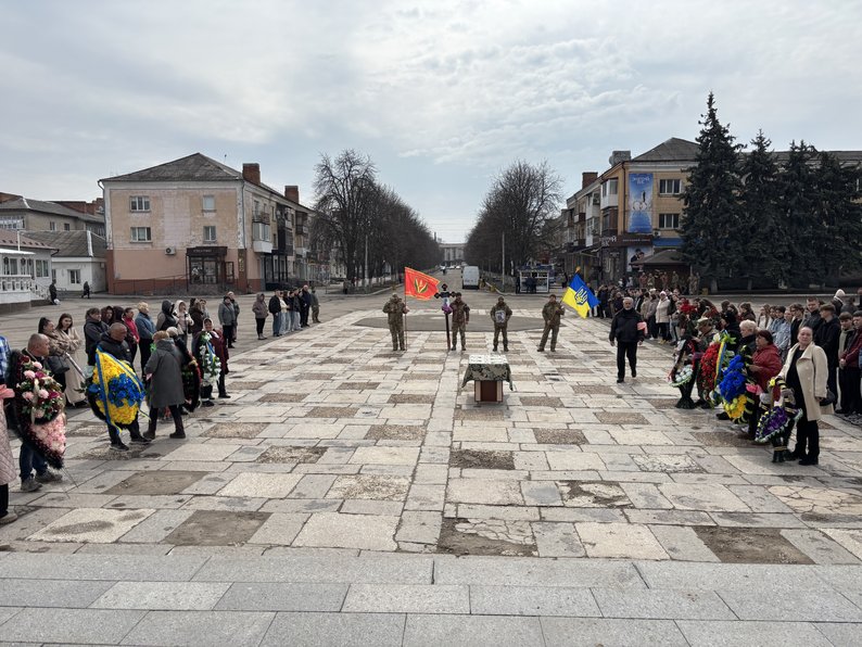 На центральній площі імені Тараса Шевченка у Первомайську провести в останню путь прийшли рідні, побратими та місцеві жителі.