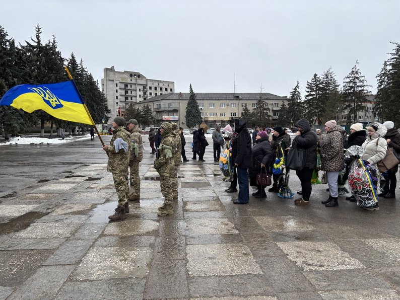 На центральній площі імені Тараса Шевченка у Первомайську провести в останню путь прийшли побратими, військовослужбовці, жителі та місцева влада.