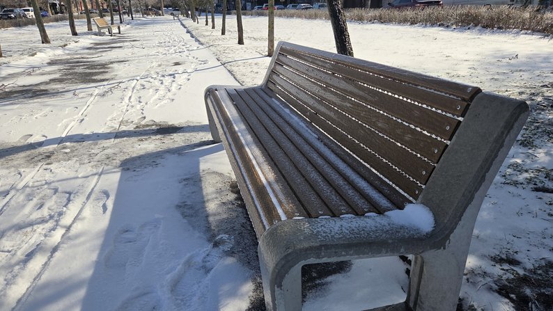 Лавка вкрита льодом та присипана снігом. Суспільне Миколаїв/Маріетта Мкртчян