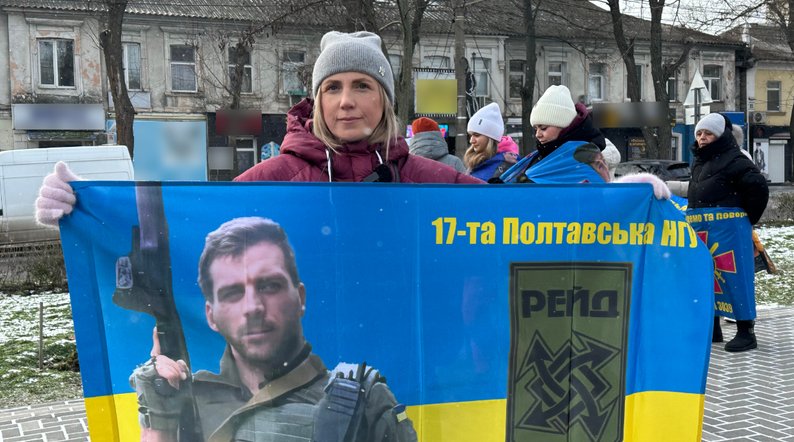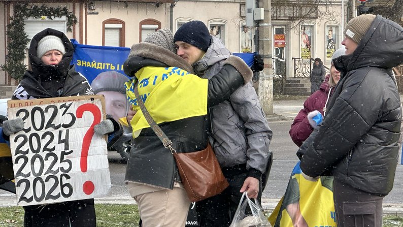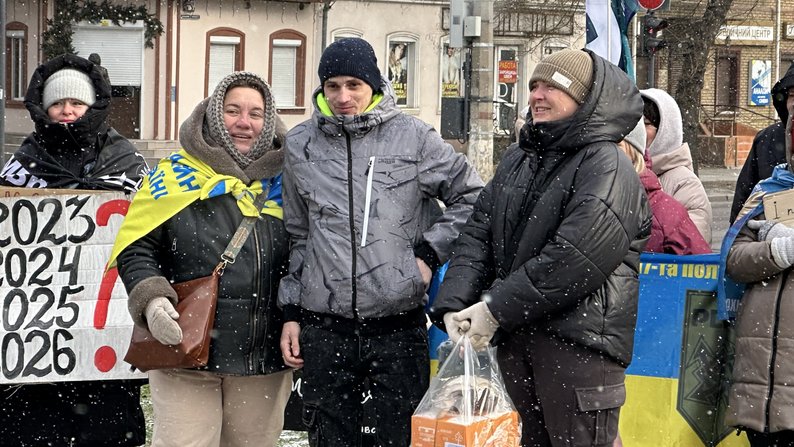 Звільнений з полону військовий Іван поруч із учасниками акції. Суспільне Миколаїв/Назарій Рубаняк У Миколаєві 18 січня вчергове нагадали про полонених та безвісти зниклих військових. На акцію зібралися 110 людей. Під час заходу миколаївці привітали звільненого з полону українського військовослужбовця.