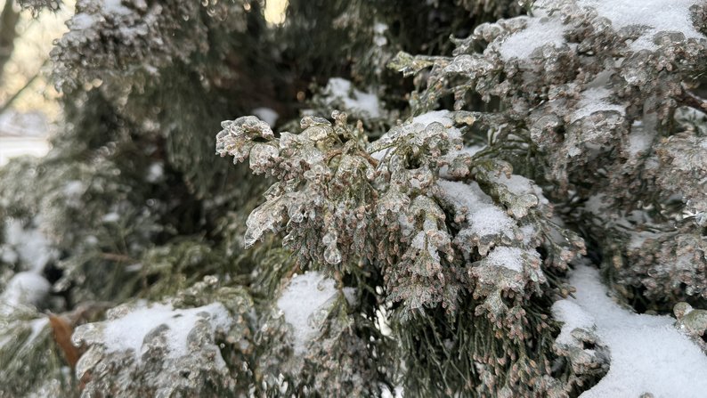 Гілки сосни, вкриті кригою. Суспільне Миколаїв/Юлія Голокоз У Миколаївській області протягом 6 лютого очікуються мінлива хмарність, мокрий сніг з дощем. Також прогнозується ожеледь та ожеледиця на дорогах. Температура повітря становитиме до +1°C. Вночі температура впаде до -2°C.