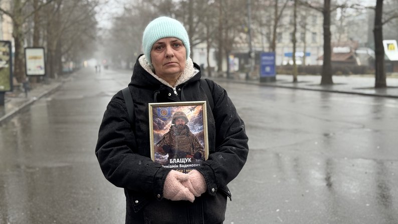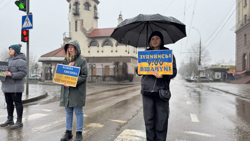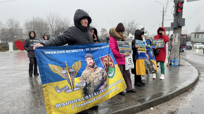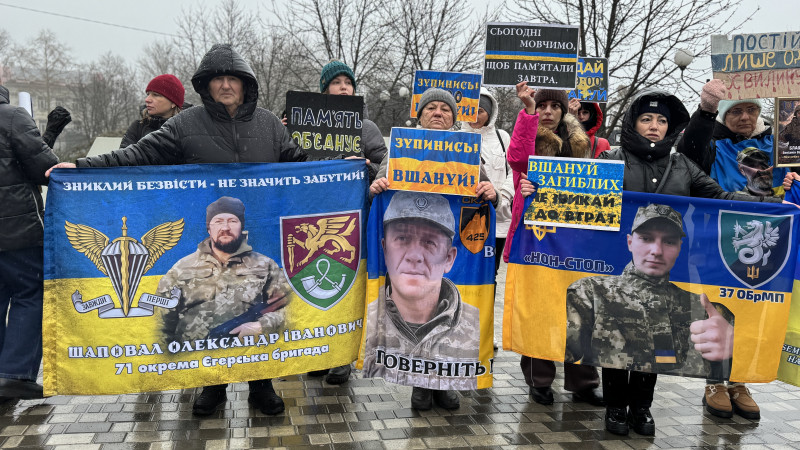 Люди під час хвилини мовчання у Миколаєві. Суспільне Миколаїв/Юлія Голокоз У центрі Миколаєва 15 лютого відбулася традиційна хвилина мовчання. Попри дощ, родичі військових вийшли на вулицю з портретами та плакатами, аби вшанувати пам'ять полеглих захисників та нагадати про тих, хто зник безвісти.